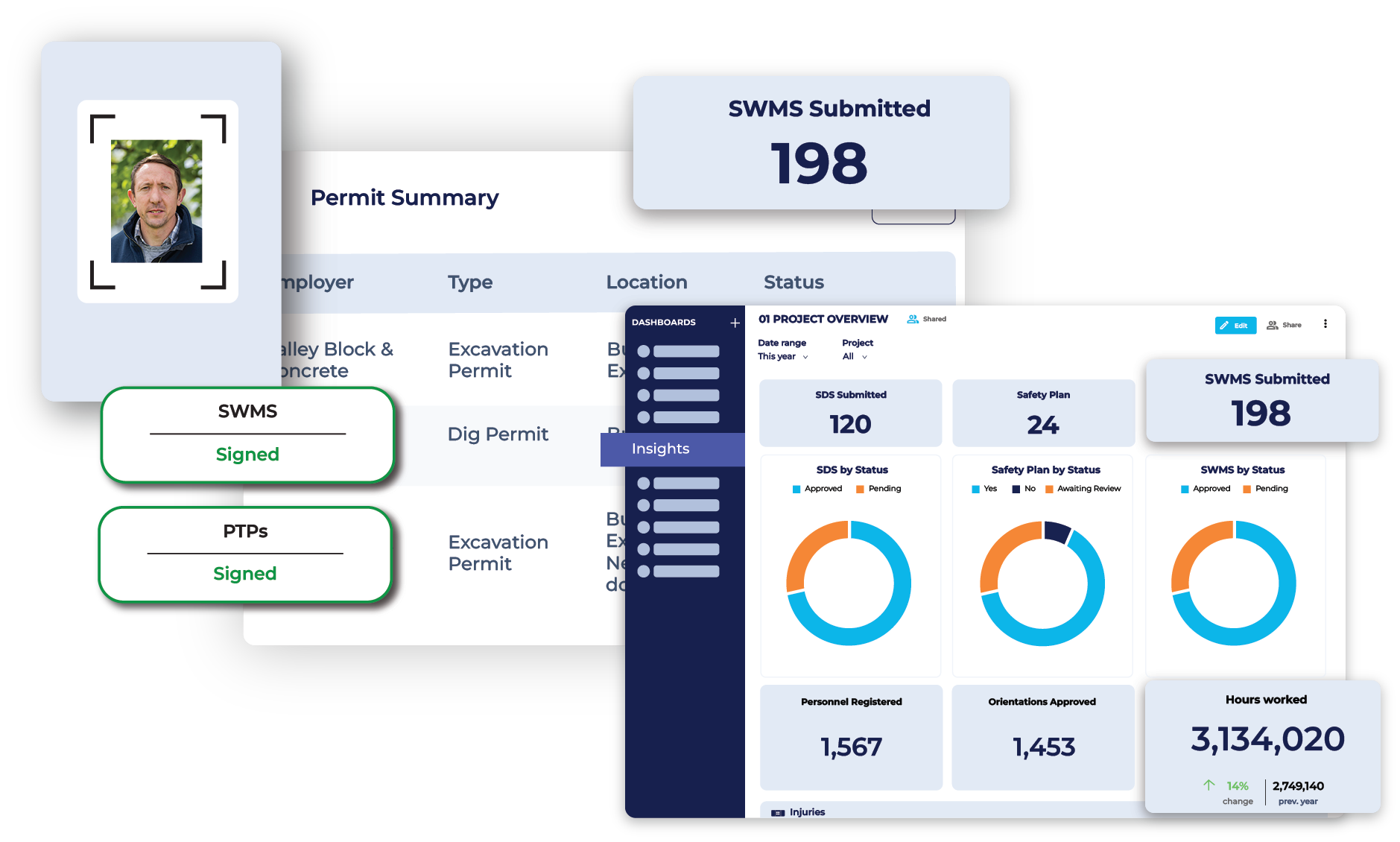 Shows multiple stacked images, facial recognition site entry, SWMS submitted, hours worked, and permit summary - all part of HammerTechGO