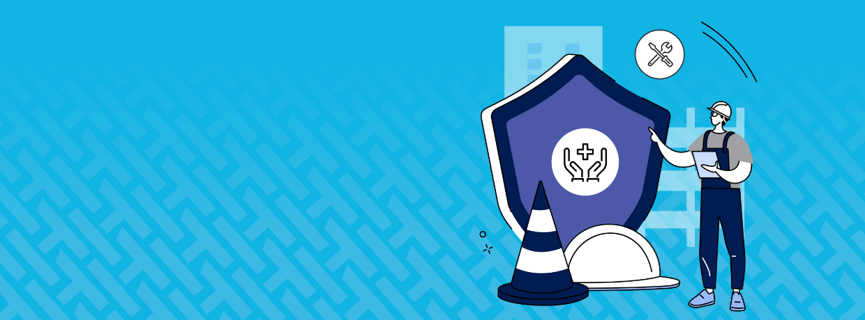 HammerTech background with illustration of shield, hard hat, safety cone, and construction worker in front of a building for PSIF illustration.