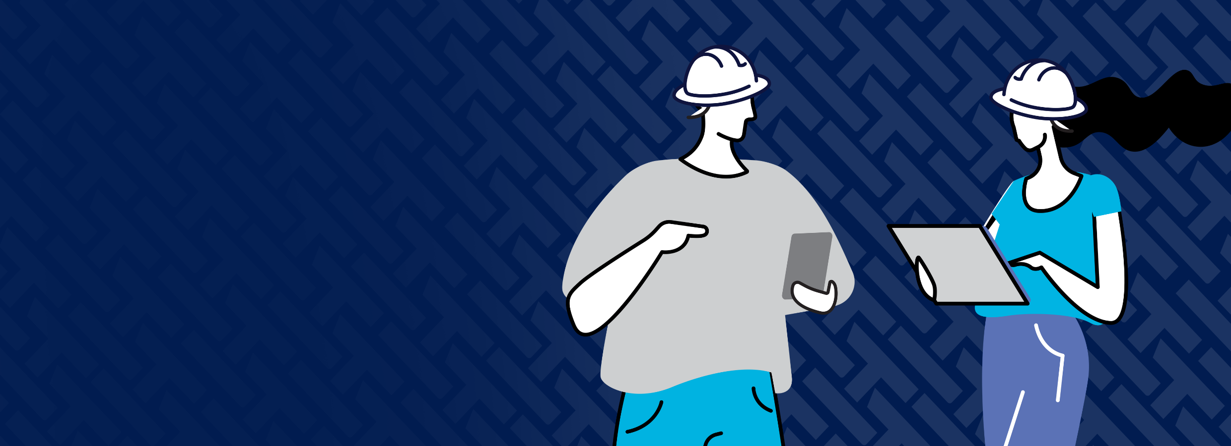 • Image of two PCL construction workers on iPads discussing safety procedures.