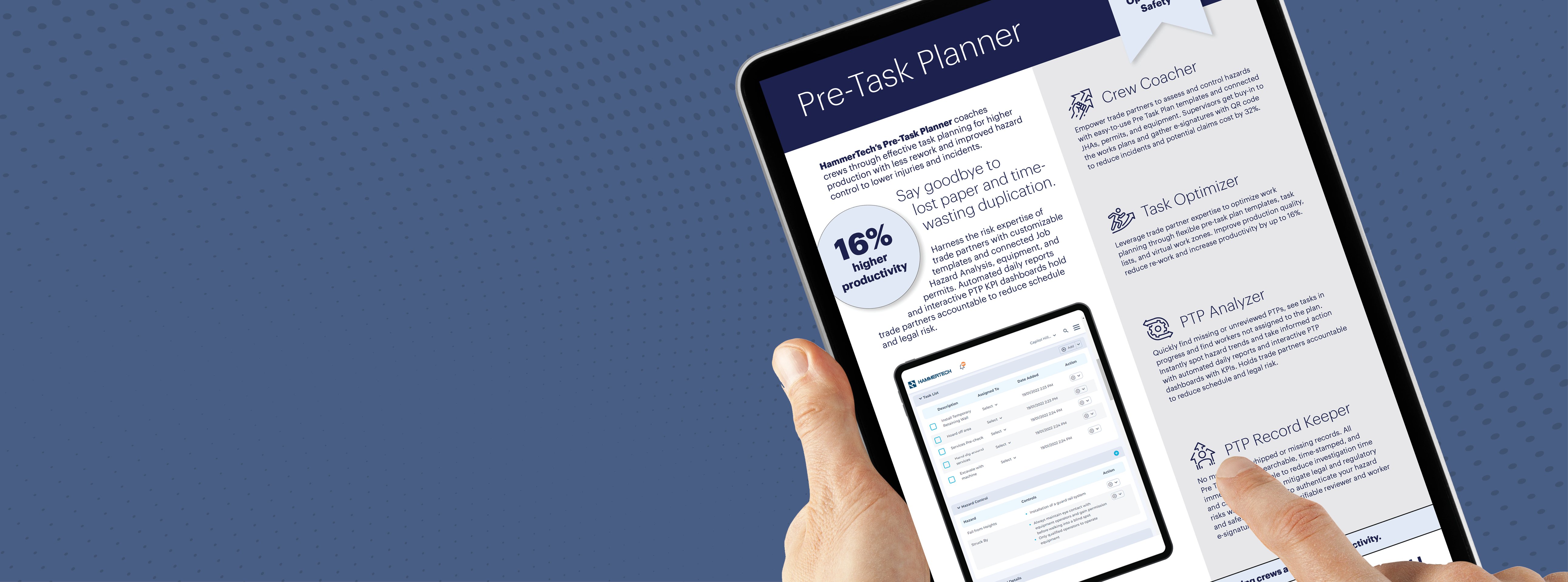 HammerTech's Pre Task Planner is specifically designed for general contractors managing subcontractors. It helps you and your subcontractors easily create and collaborate on daily Pre Task Plans. It reduces pencil-whipping, facilitates communication among team members, and shows exactly which tasks are in progress. Learn more about HammerTech's Pre Task Planner here.